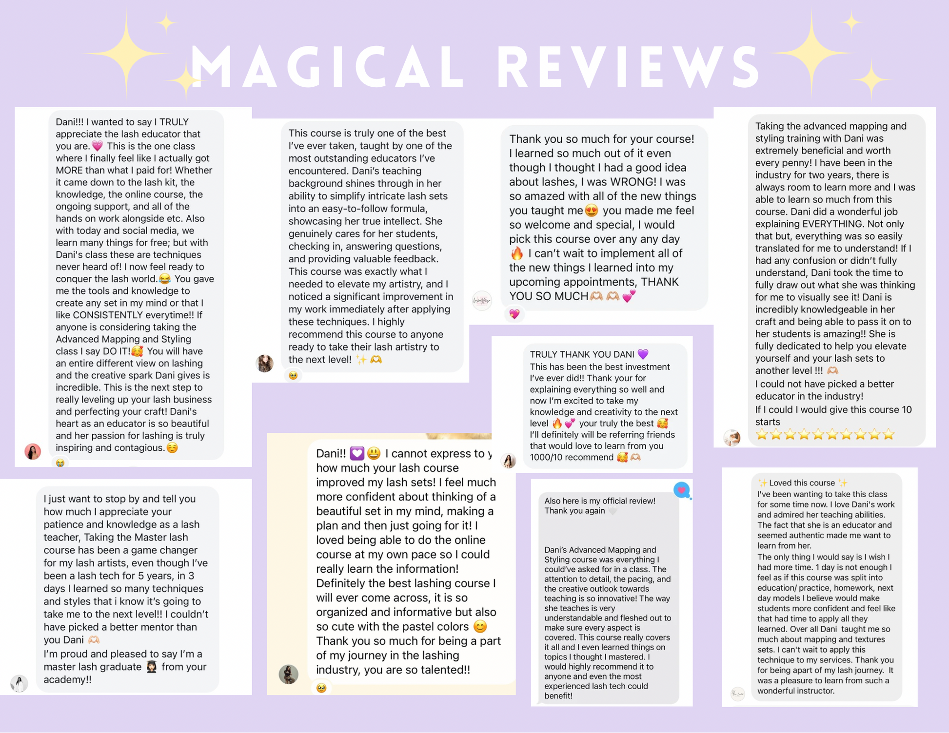Learn all of my go to volume techniques! During my 2 day training, I teach you how to create wide and narrow volume fans by hand. You learn how to lash wrap and how to effectively obtain your best retention yet! Styling and mapping is a big focus during my training. My secret styling formula and mapping techniques teach you how to create unique and versatile styles for any client regardless of their eye shape.